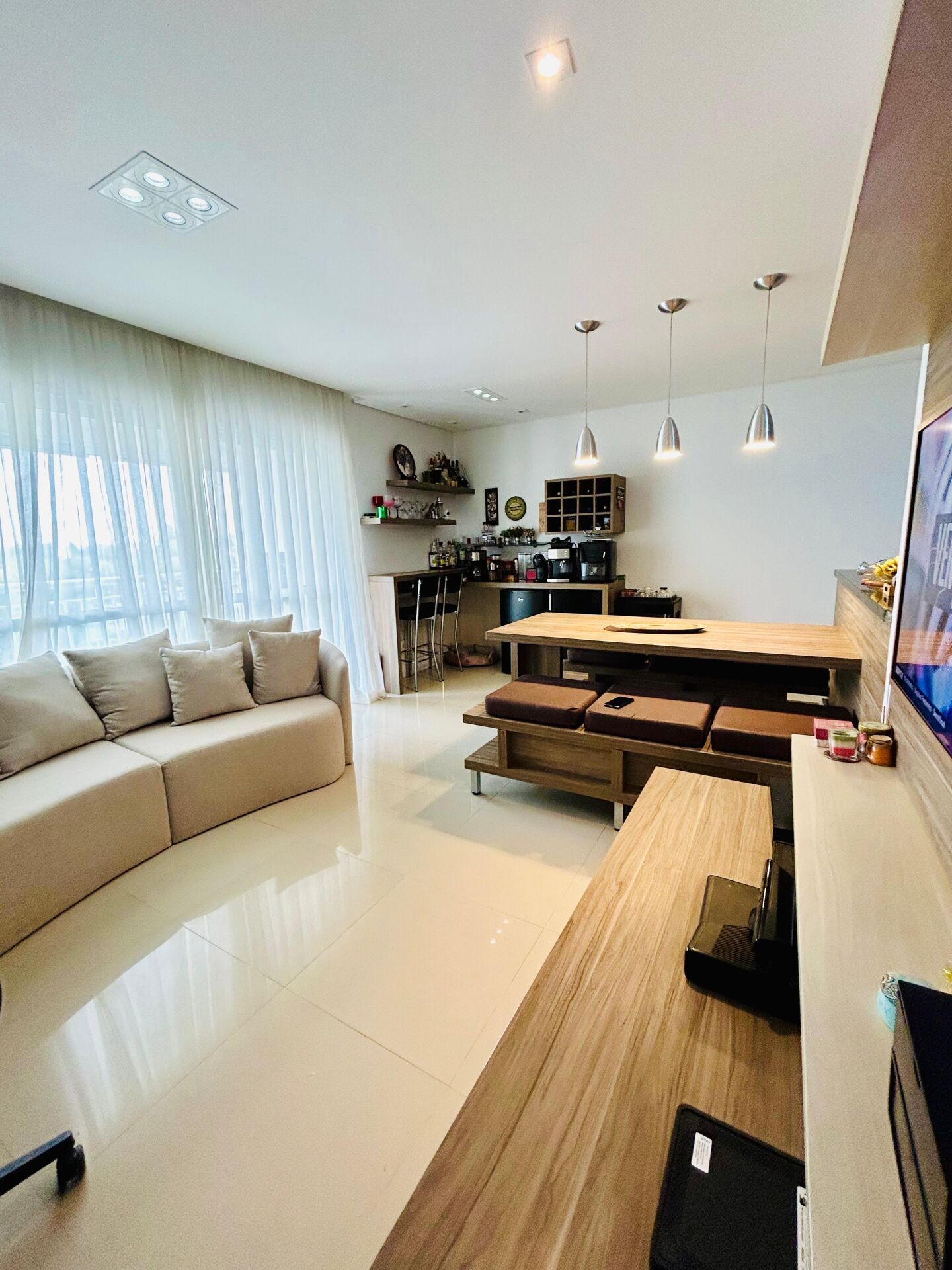 Sala ampla com espaço para dois ambientes confortáveis e bem iluminada, lavabo e sacada gourmet com fechamento em vidros.
