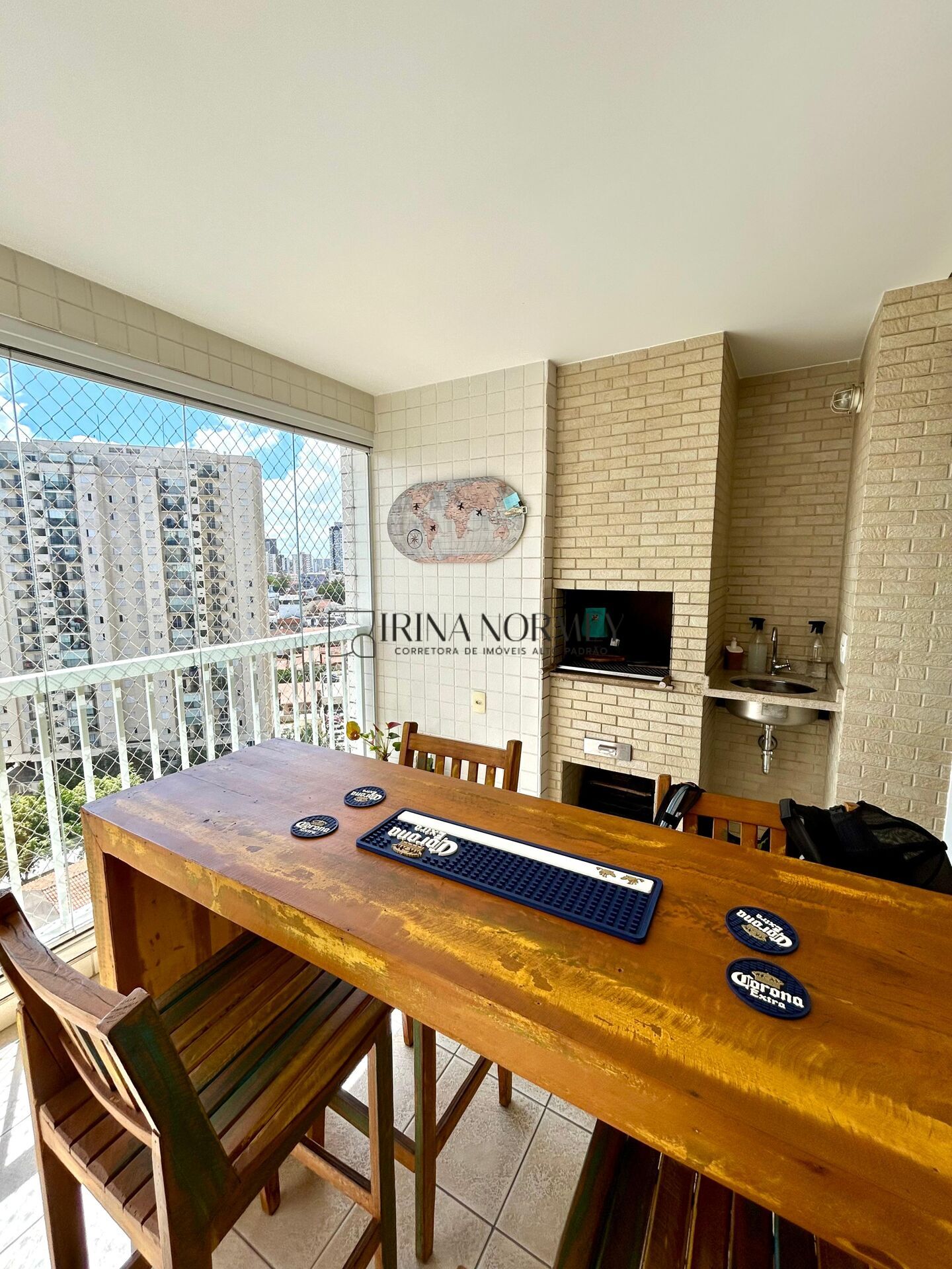 Sacada gourmet com churrasqueira e fechamento em vidro, integrada com a sala e com a cozinha, excelente para receber amigos e familiares.