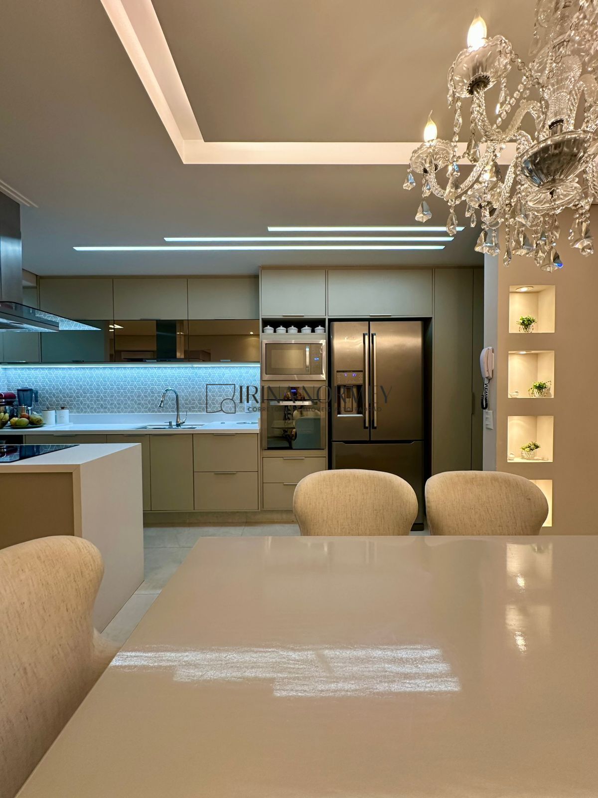 No Jantar de Luxo, desfrute de momentos especiais na mesa em laca e madeira nobre para 6 lugares, acompanhada por cadeiras sofisticadas. Todos os eletrodomésticos permanecem, incluindo a Geladeira Electrolux 540L (com dispenser de água) e o cooktop Brastemp.