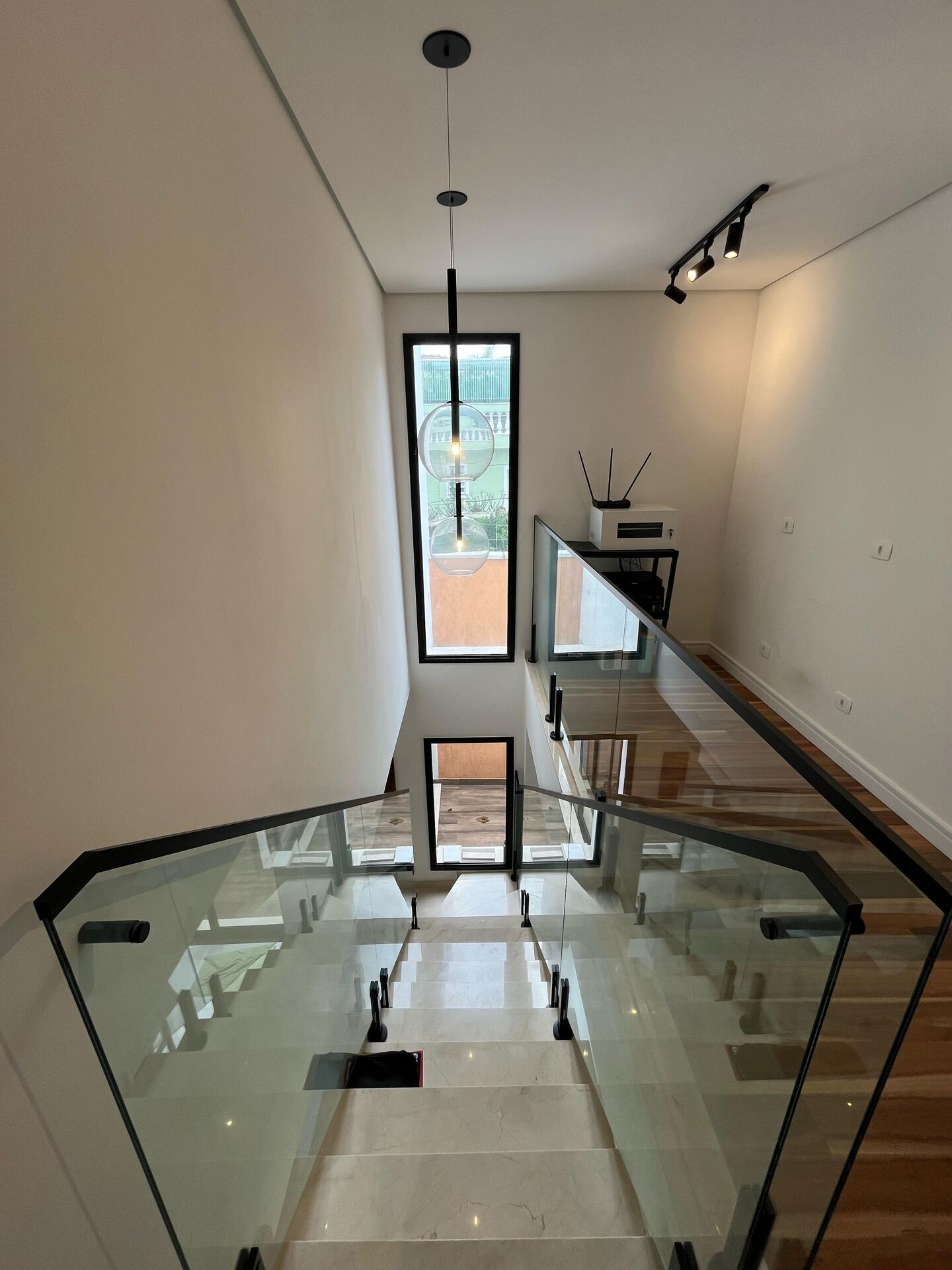 Escada em Mármore e guarda corpo de vidro de acesso aos quartos, banheiros e home office integrado;